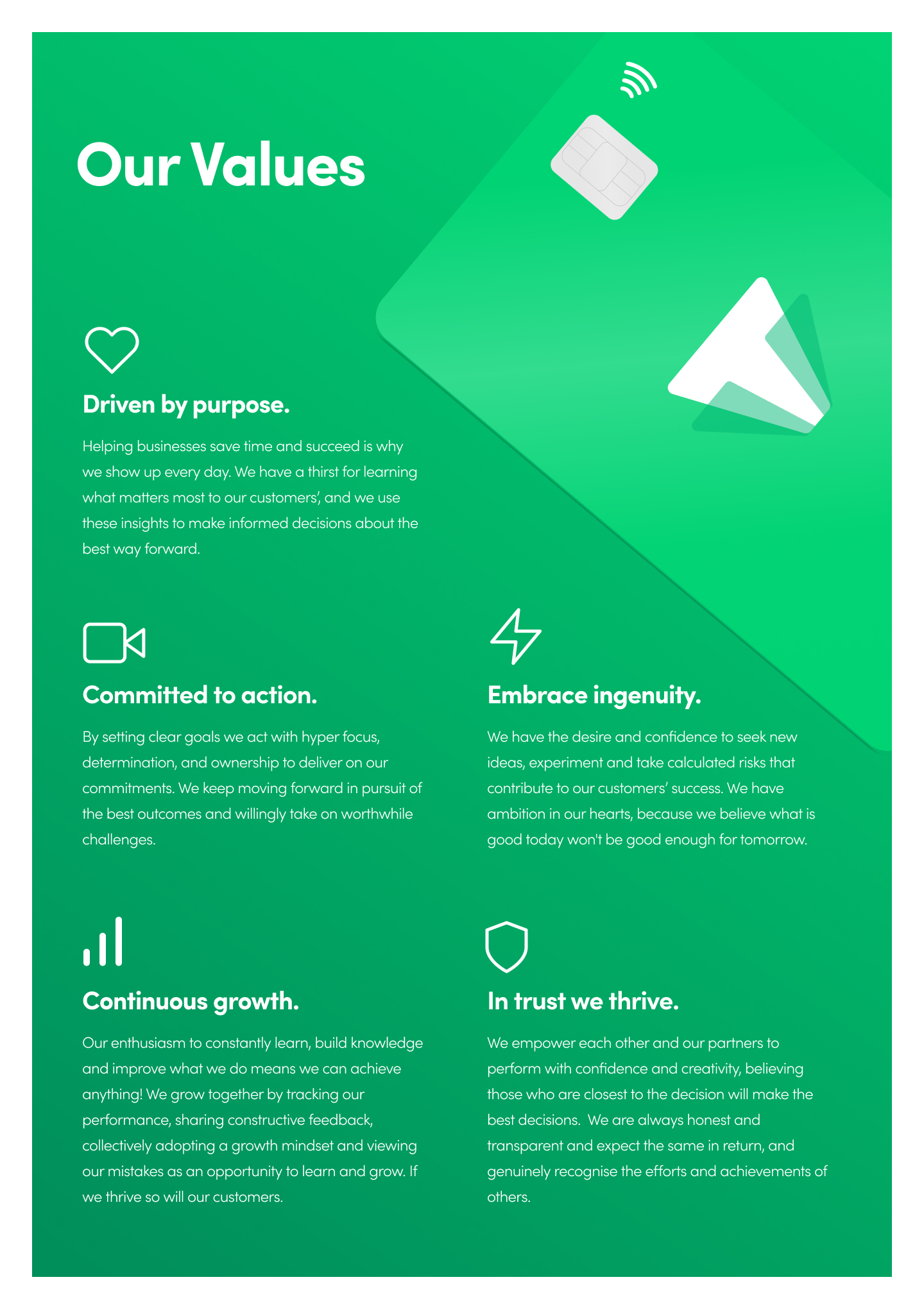 When your values are clear, making decisions is easy. How you communicate, how you act, what work activities you prioritise and more importantly how you treat each other, should be easy to manifest. Values create a purpose, improve team cohesion, and result in a sense of focus.